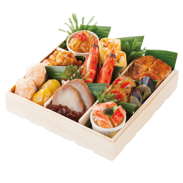 フカヒレの姿煮ゼリー寄せ、国産車海老のうま煮、国産豚肉の焼豚、たらば蟹の甘酢キャビア添えなど中華おせちの代表的料理を詰合せたミニ中華おせちです。