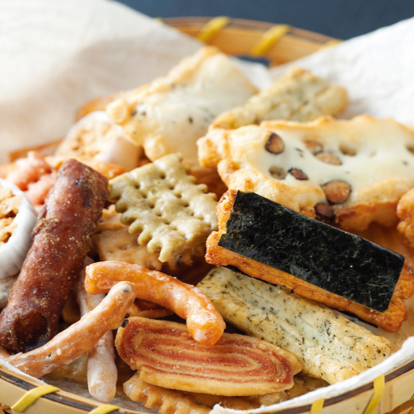 海苔巻きをはじめ、食感、味付けの異なるおかきと、黒糖、胡麻等、小ぶりなかりんとうをお楽しみいただけます。