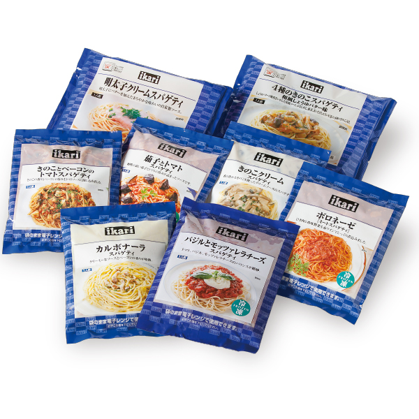 バジルとモッツァレラチーズ、カルボナーラ、きのこクリーム、きのことベーコンのトマト 、茄子とトマト、ボロネーゼ、4種のきのこ和風醤油バター味 各280g(1人前)、明太子クリーム275g(1人前)