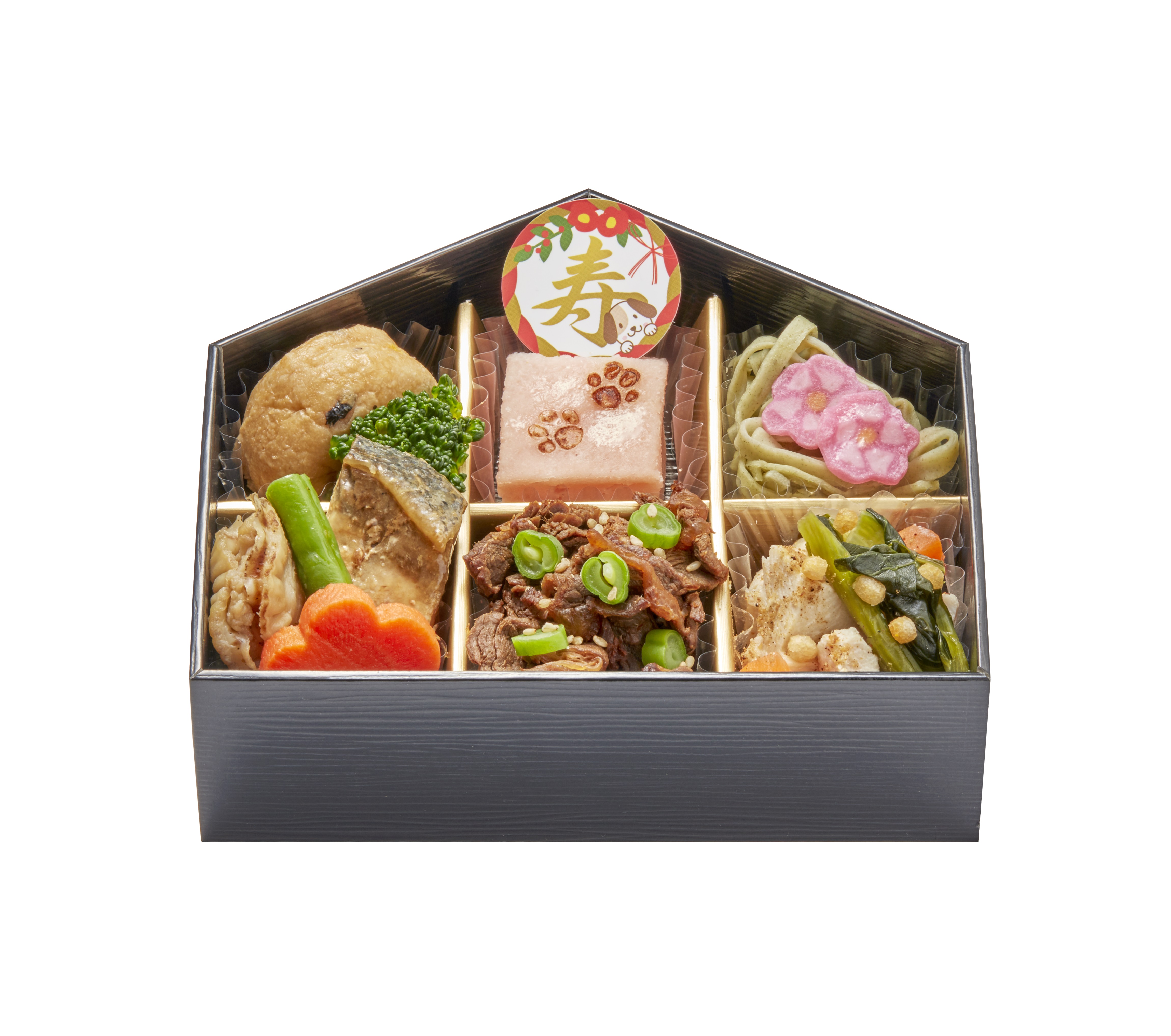 ぶり照焼、花型人参、馬肉のしぐれ煮、鶏肉のお雑煮風出汁和え