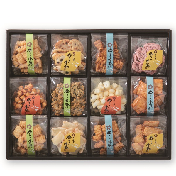 濃厚いか揚げ(23g×2)、黒豆もち(30g)、胡麻桜(25g)、カマンベール(25g)、おつまみ黒胡椒(20g)×2袋、 しそせんべい(25g)、角醤油(20g)、熟成旨あま醬油(30g)、サクふわ揚げしお(30g)、ざらめおかき(30g)