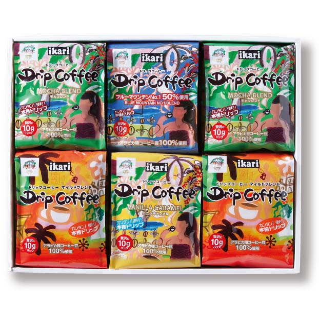 ドリップコーヒー[モカブレンド(10g×10袋入)、マイルドブレンド(10g×10袋入) 各2袋、ブルーマウンテンNo.1ブレンド(10g×6袋入)、バニラキャラメル(10g×8袋入)]