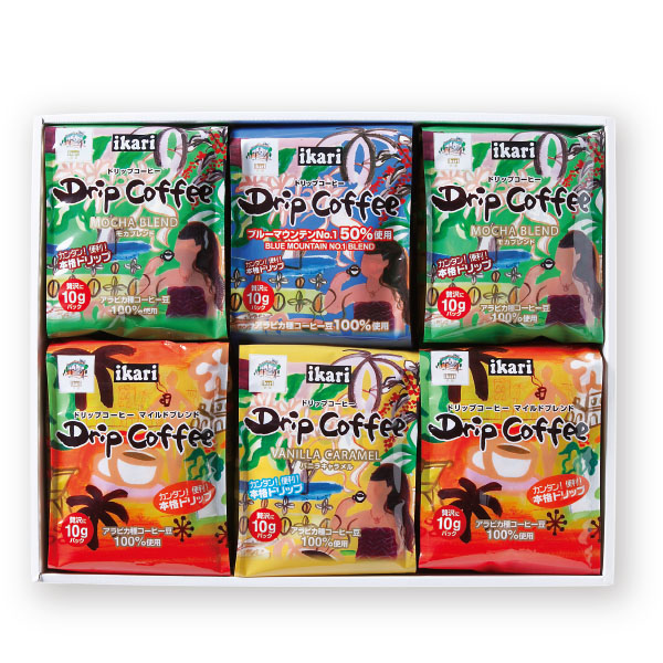 ドリップコーヒー[モカブレンド(10g×10袋入)、 マイルドブレンド(10g×10袋入) 各2袋、ブルーマウンテン No.1ブレンド(10g×6袋入)、バニラキャラメル(10g×8袋入)]