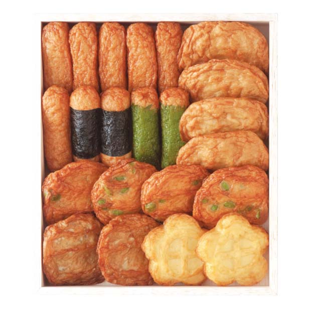 特揚げ棒天 6本、のり巻棒天、しそ巻棒天 各2本、枝豆天、 しょうが天 各4枚、ごぼう天 2枚、梅おはら揚げ(黄)2個