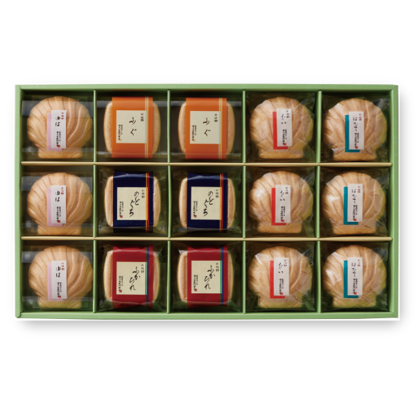 15椀入[箱サイズ:約25.5×41.5×5.5cm] ゆば、たい、ほたて(各3個)、ふぐ、のどぐろ、ふかひれ入り(各2椀)