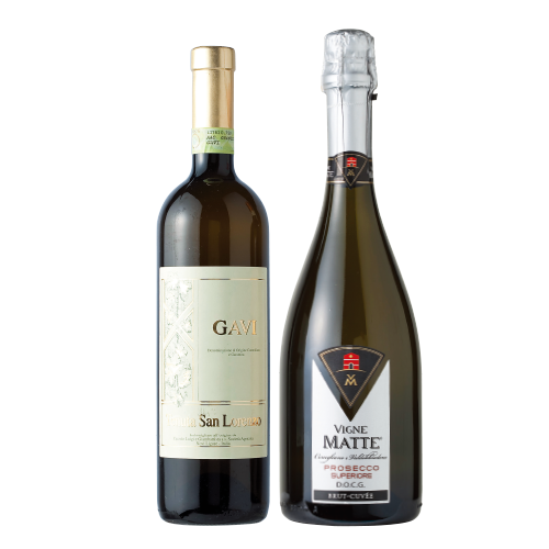 シャンパンに勝るとも劣らない 高品質なスパークリングワイン・プロセッコと 北イタリアの特級格付けの辛口白ワイン・ ガーヴィーのセット。