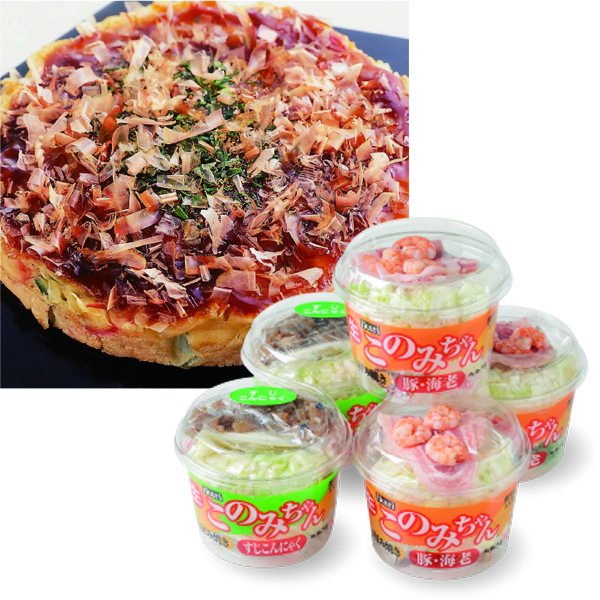 関西風お好み焼きが簡単に。 一人前の材料を全てセットしました。ホットプレートがあれば、混ぜて焼くだけで出来上がり。