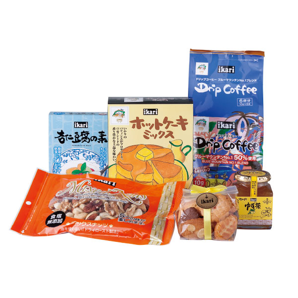 いかり ミックスナッツ(食塩無添加)(200g)、いかり芦屋 ホットケーキミックス(200g×2袋)、 いかり芦屋 ドリップコーヒー ブルーマウンテン No.1 ブレンド(10g×6袋入)、 いかり ミックスクッキー(100g)、いかり ゆず茶(200g)、いかり 杏仁豆腐の素(80g)