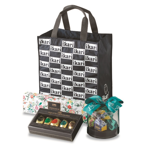 インプレッション プラリーヌ5個入、ラ・ペルラ トリュフ クインテット(5個入)、リキュールチョコ(5個入)、いかりオリジナル ミニバッグ ブルー