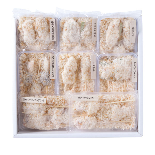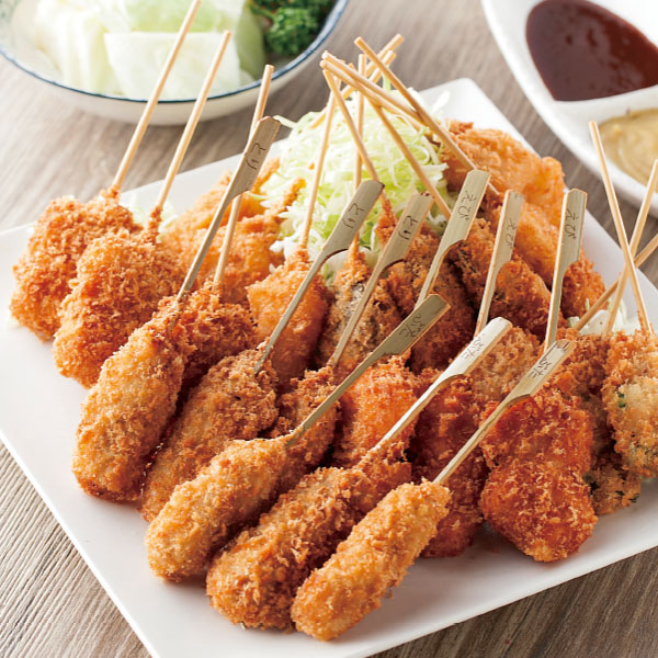 串カツ(カツと玉ねぎ、ホタテ貝柱としいたけ、はもちくといんげん、 豚ヒレ肉、梅肉大葉風味の鶏肉、海老、アスパラベーコン、 じゃが芋)各3本、カツソース30g×3袋