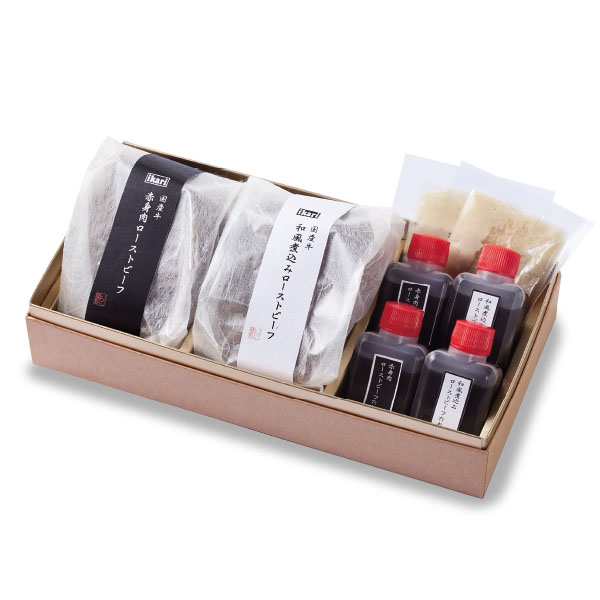国産牛赤身肉ローストビーフ(約200g)、国産牛和風煮込みローストビーフ(約200g)、ローストビーフのたれ、和風煮込みローストビーフのたれ、 レホール 各2個 [箱サイズ:約11cm×22.5cm×7cm]  ※一部パッケージが変更になる場合がございます。