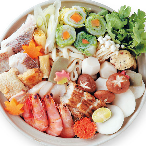 鶏肉、鯛、海老、餅、焼穴子、がんもどき、貝柱、生麩、干し湯葉、鍋つゆ、 うどん、鍋野菜各種、薬味(すだち、もみじおろし、青ねぎ)