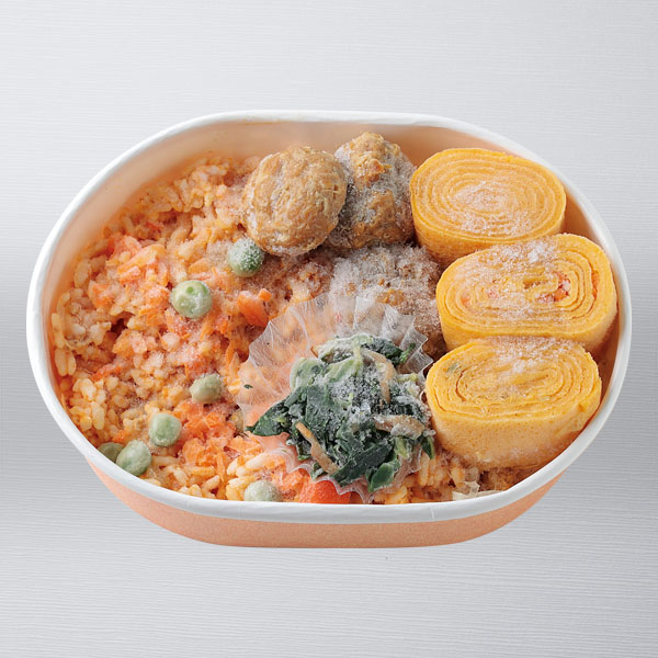 ふんわり玉子焼きとジューシーなミートボール。どこか懐かしい味わいのチキンライス弁当です。